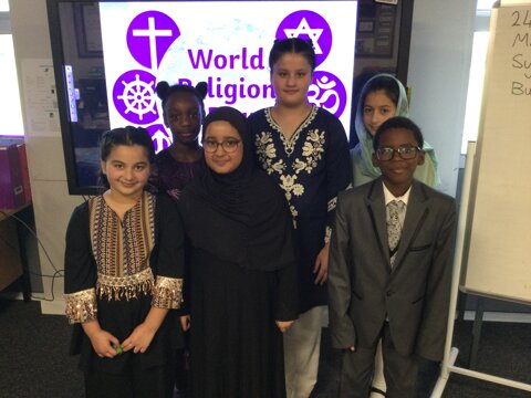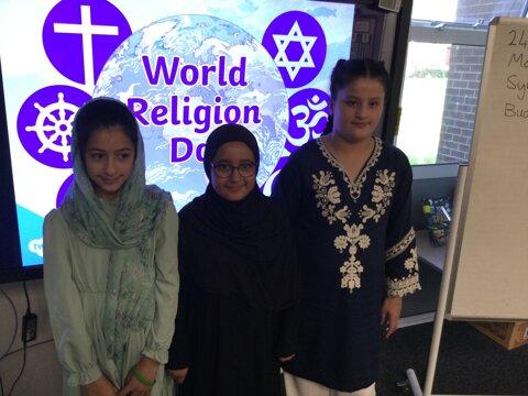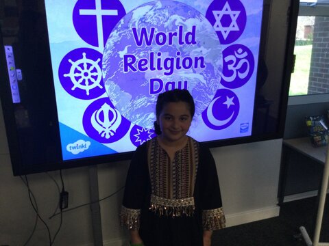 KS2 children have taken part in a world Religion Day today. They have come in clothes that represent their religion or some traditional dress.