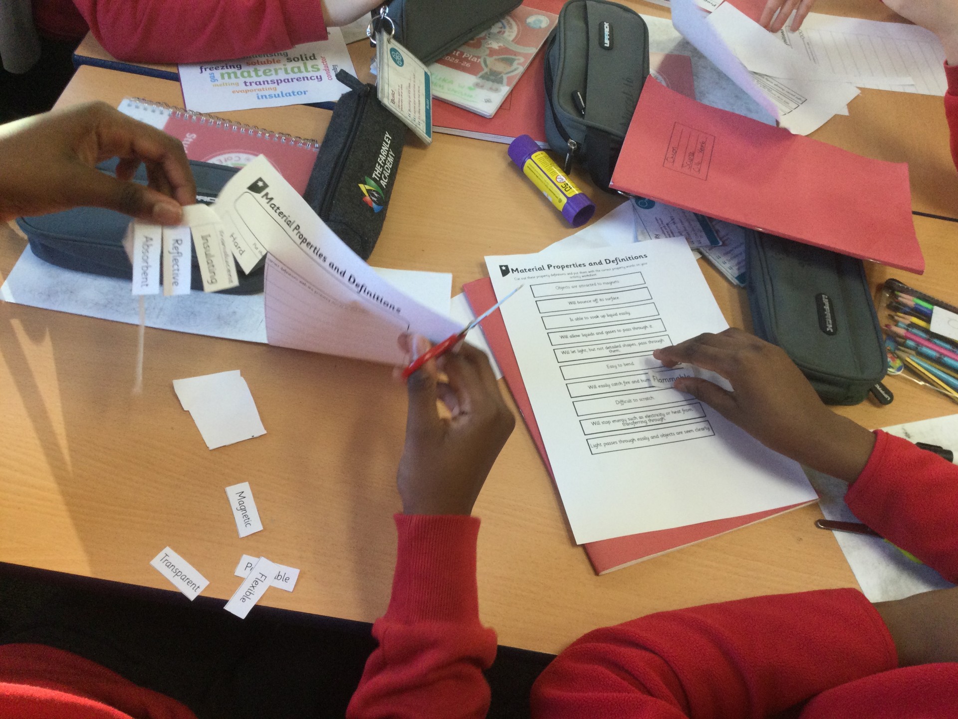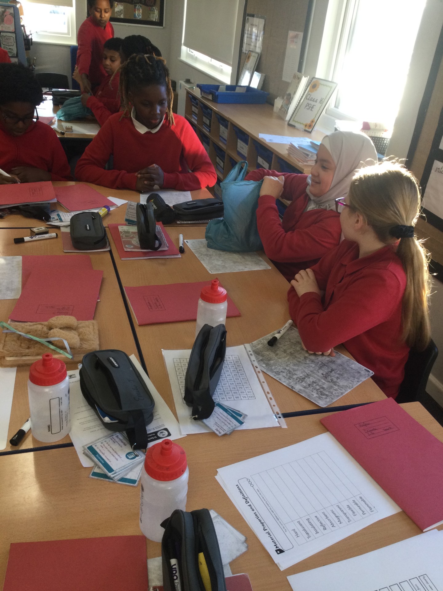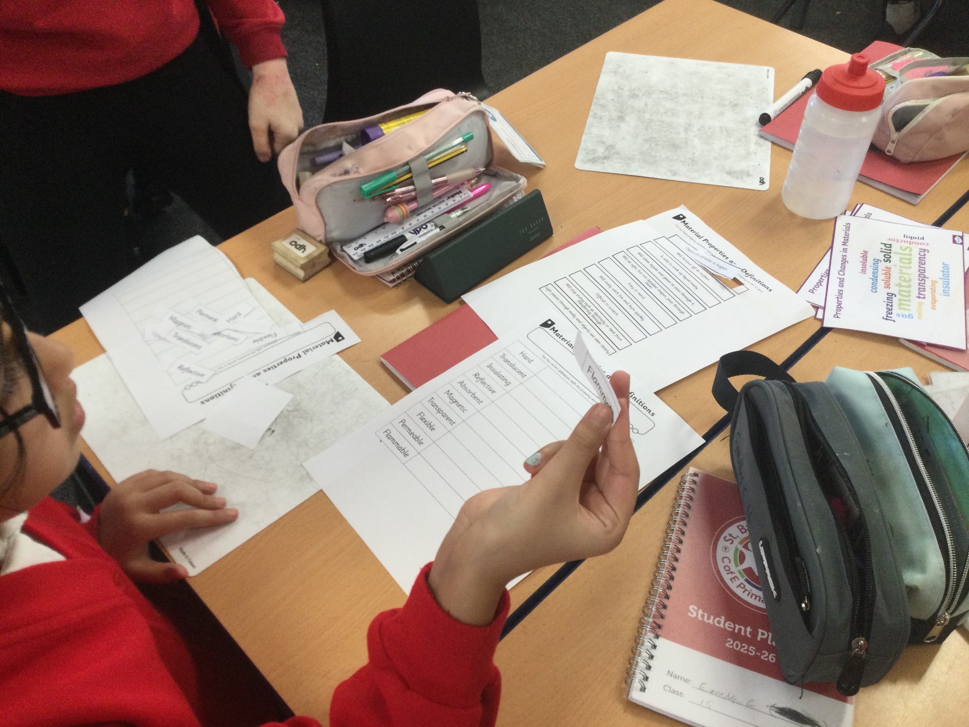 Then, we categorised properties and definitions, and finally the children conducted an experiment, where they tested different materials for hardness, flexibility, transparency, permeability and magnetism.