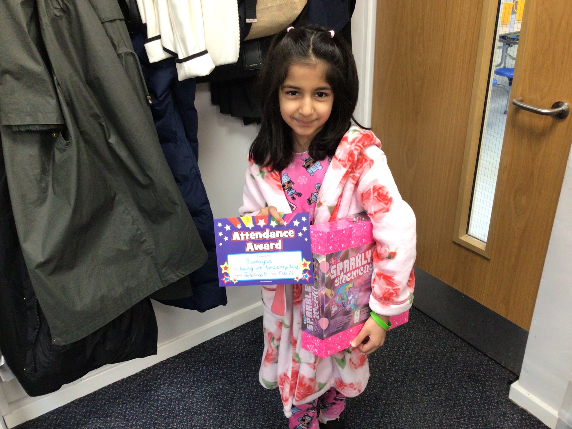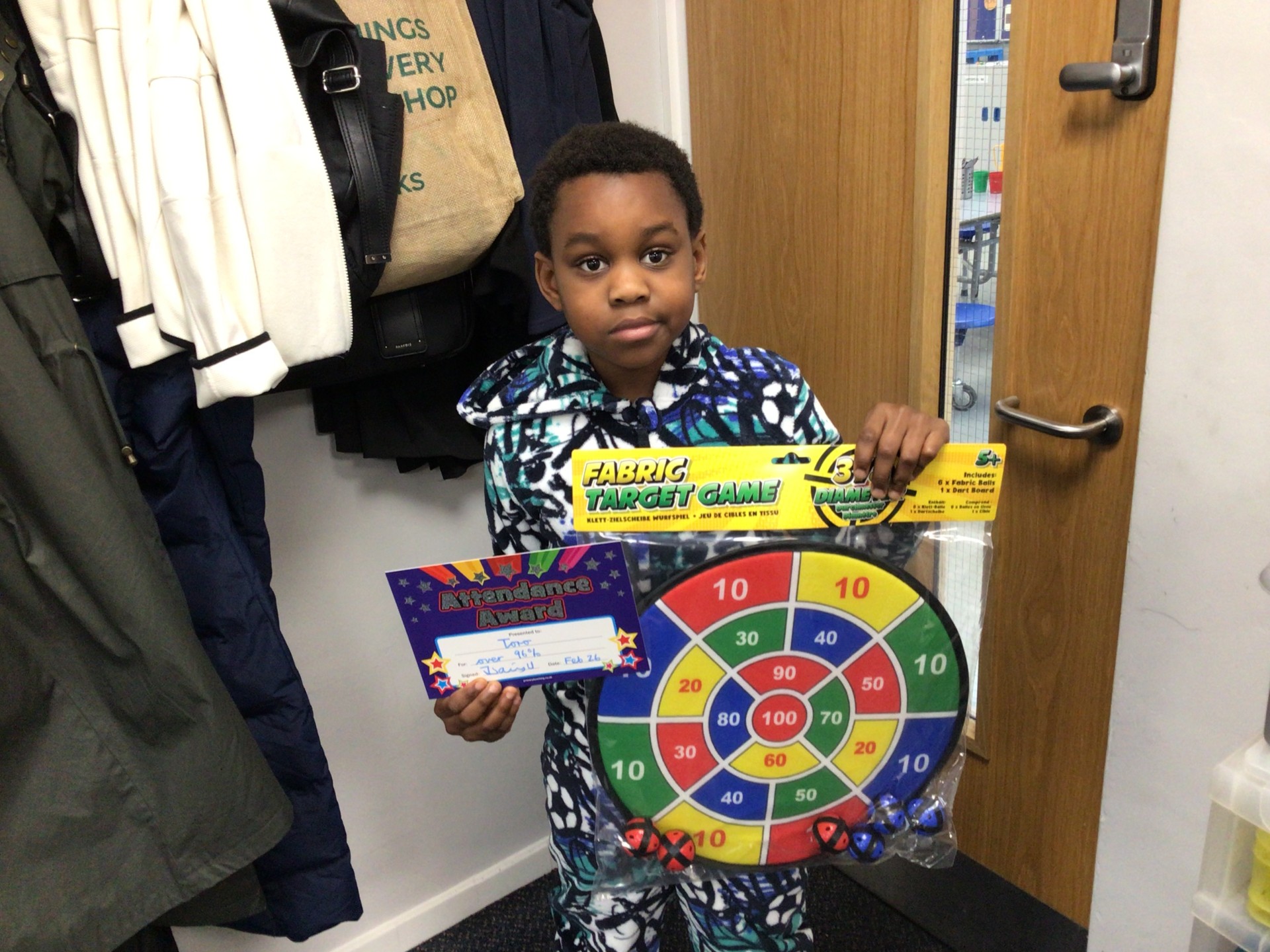 We draw winners for children who have; been in school on time every day, been in school above 95%, been in school every Friday and been in school every day in the last week.